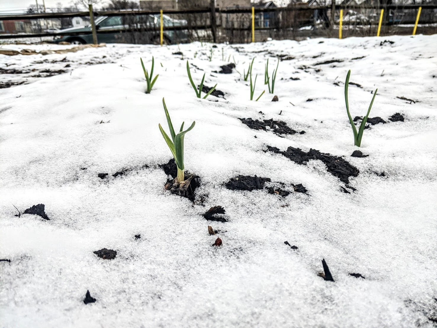Garlic pushing it’s way past the crusty snow- a sure sign of spring!