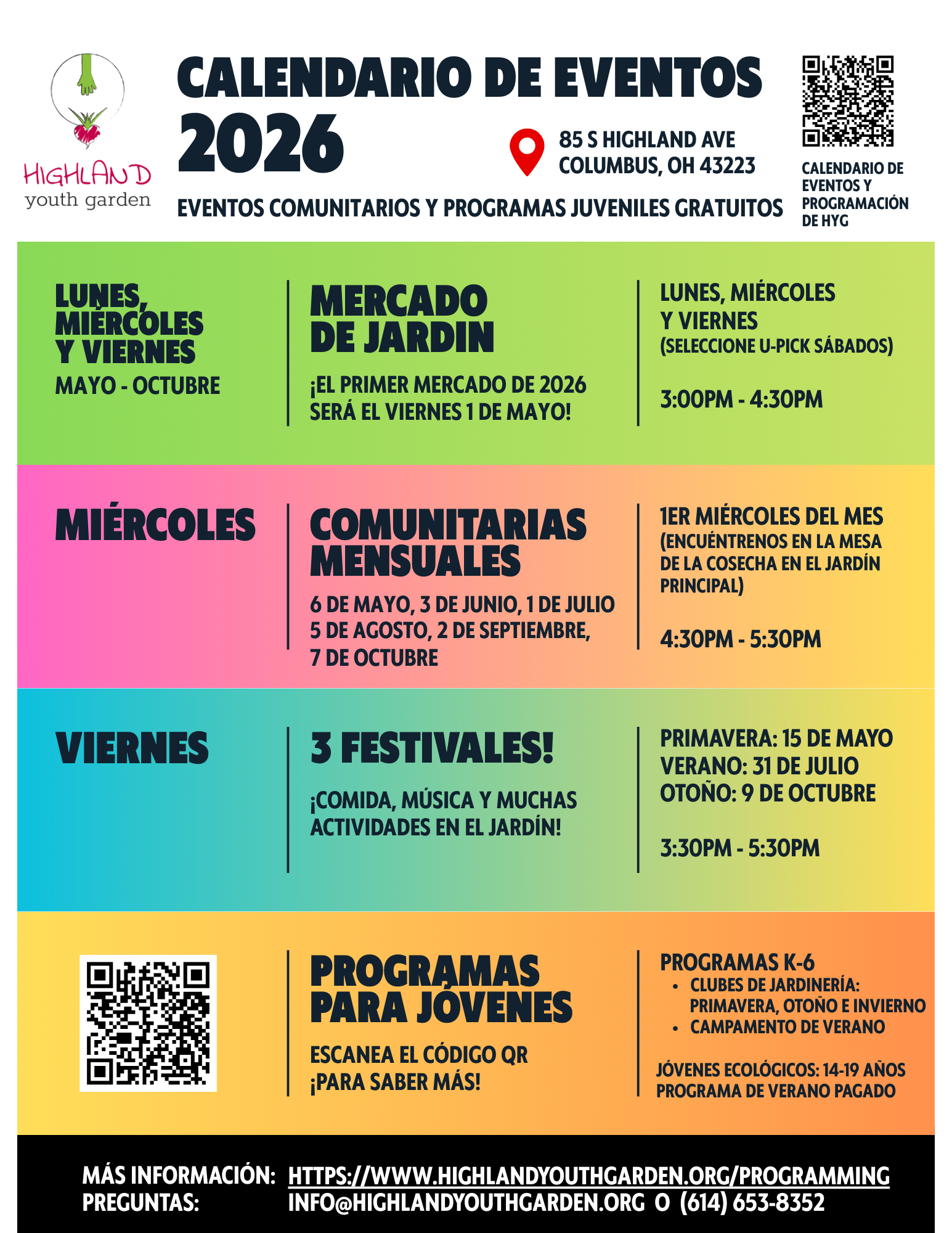 Visita nuestra página de programación para obtener más información.Si tiene alguna pregunta, envíe un correo electrónico a info@highlandyouthgarden.org.